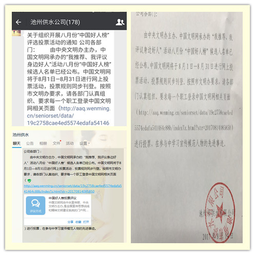 為弘揚社會正氣,引領文明風尚,由中央文明辦主辦、中國文明網承辦的“我推薦我評議身邊好人”活動正在開展。按照池州市文明委的要求,814日,池州市供水有限公司組織全體員工開展學習宣傳“中國好人榜”,并積極投票。