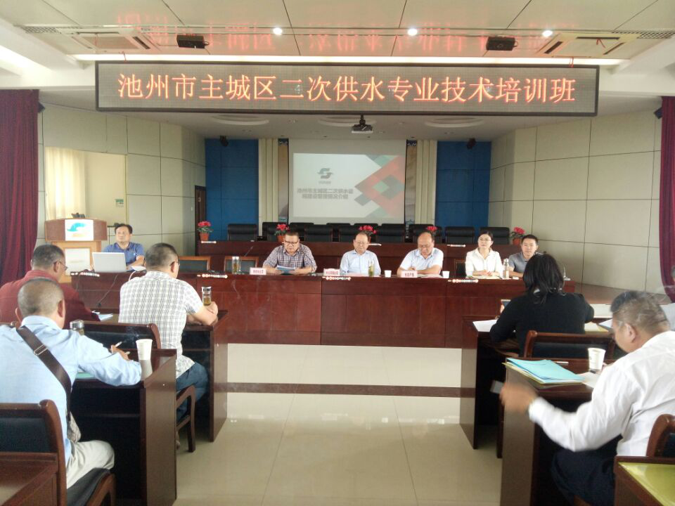 為普及二次供水設施維護管理知識,保障主城區(qū)二次供水安全優(yōu)質供水,2017年9月22日上午9時,首次池州市主城區(qū)二次供水專業(yè)技術培訓班在池州市供水有限公司開班,本次培訓由池州市公用事業(yè)局、池州市房產事務局主辦,池州市供水有限公司承辦。來自池州市主城區(qū)、青陽、石臺、東至70多家物業(yè)公司共計80余二次供水泵站管理人員參加本次培訓。池州市供水有限公司總經理吳小平主持本次培訓,池州市公用事業(yè)局局長李應友、池州市房產局物業(yè)科科長吳立宏出席了開班儀式。