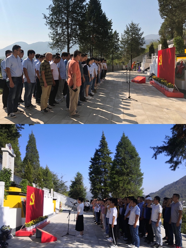 松柏環(huán)抱,階梯整潔,巍然莊嚴(yán)的棠溪留田年關(guān)暴動(dòng)烈士陵園,全體黨員懷著崇敬的心情向革命烈士鞠躬默哀致敬,表達(dá)革命烈士的深切緬懷和無限敬仰。面對(duì)鮮紅的中國(guó)共產(chǎn)黨黨旗,池州供水黨支部委員施潔領(lǐng)誓,全體黨員緊握拳頭,重溫入黨誓詞,以堅(jiān)定有力宣誓聲,表達(dá)矢志不渝守初心、奮發(fā)有為擔(dān)使命的堅(jiān)定決心。