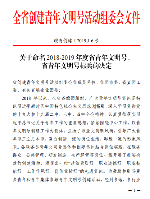 近日,安徽省青年文明號創建活動組委會傳來喜訊,池州供水有限公司客服中心集體榮獲 2018-2019 年度“省青年文明號”、城東供水管理所青年集體為 2018-2019 年度“省青年文明號標兵”榮譽稱號。