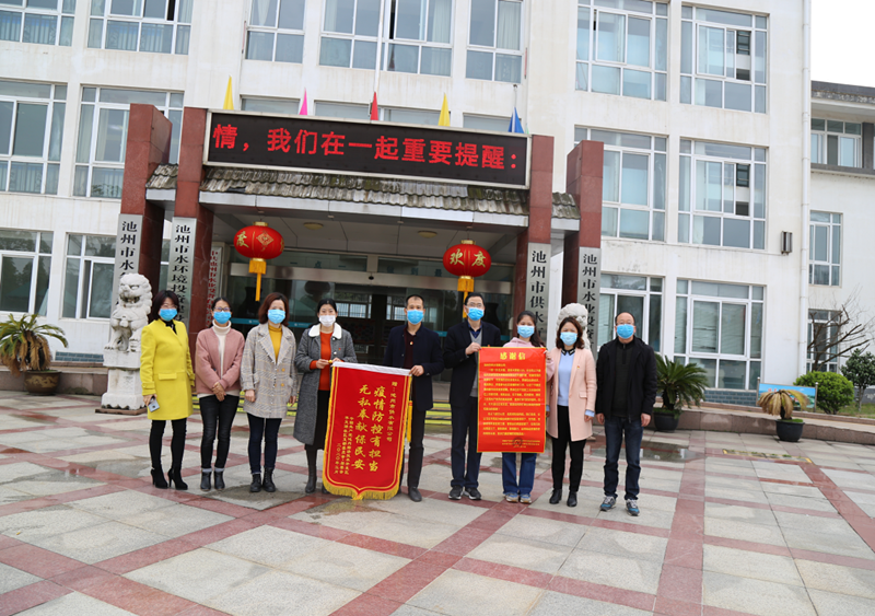 2020年3月13日上午,池州市供水有限公司大院里迎來一批特殊的客人,他們是中共池州市經開區平天湖社區支委會、居委會的工作人員,在支部書記胡桂珍書記的帶領下,向池州供水公司贈送錦旗和感謝信的。供水公司董事長、支部書記楊觀樂,總經理李張兵等領導熱情洋溢地接待了他們。