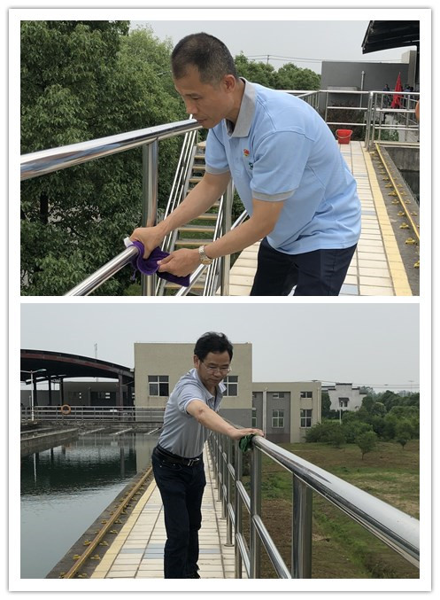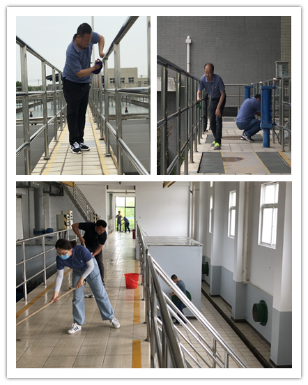 5月28日下午,初夏的江口水廠人頭攢動,由支部書記、董事長楊觀樂同志帶隊、總經理李張兵親自參與的清潔水廠活動準時開始。為了達到“比學趕超”的效果,清掃隊50余人共分6個小組,對廠區6個區域進行包保清潔。在反沖洗泵房里,他們揮汗如雨,用拖把擦洗著每一塊瓷磚;在濾池和平流池上,他們不知疲倦,用抹布擦拭著每一處欄桿;在加藥間中,他們認真細致,用掃帚清掃每一處的衛生死角;在送水車間里,他們專心致志,用清水沖刷著每一處地面,他們用實際行動彰顯池城供水“守護者”身份。