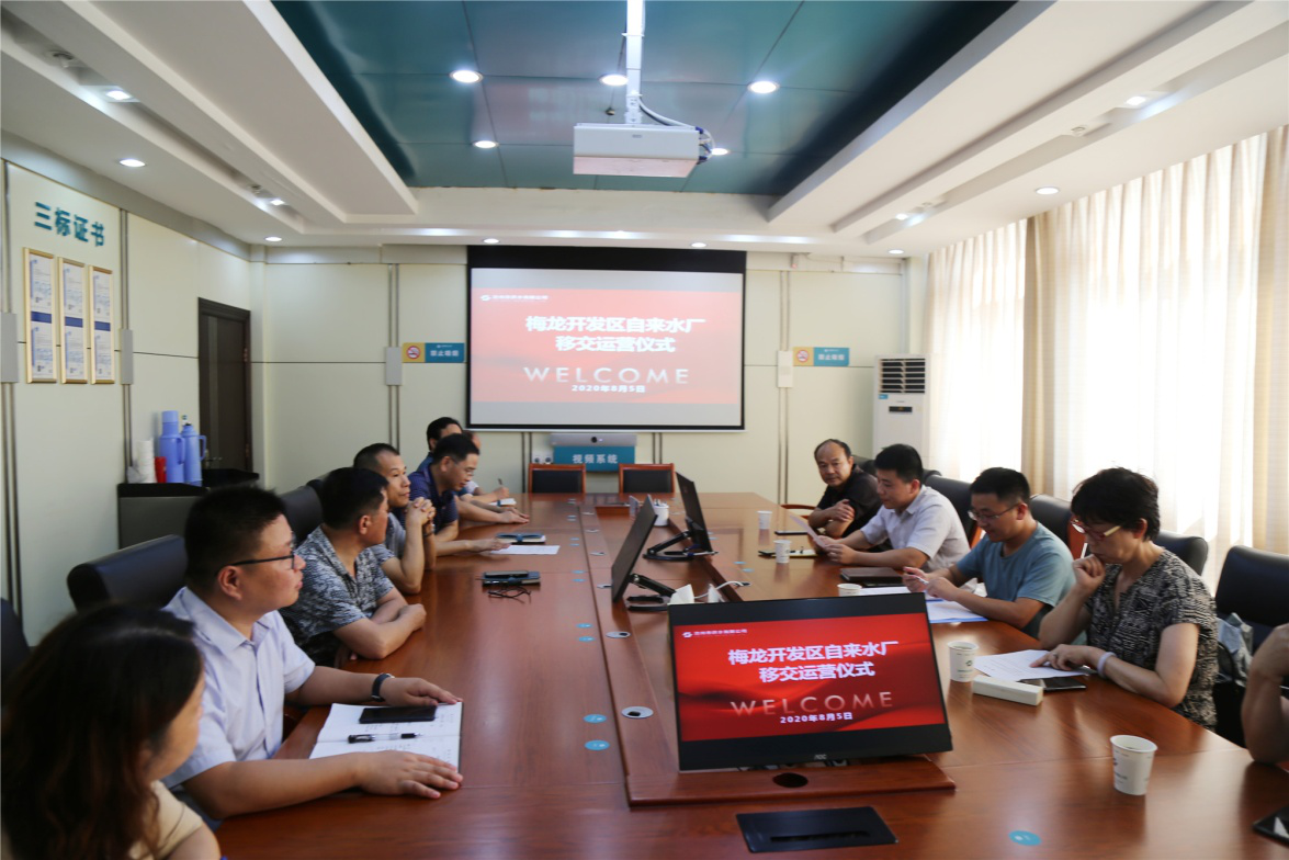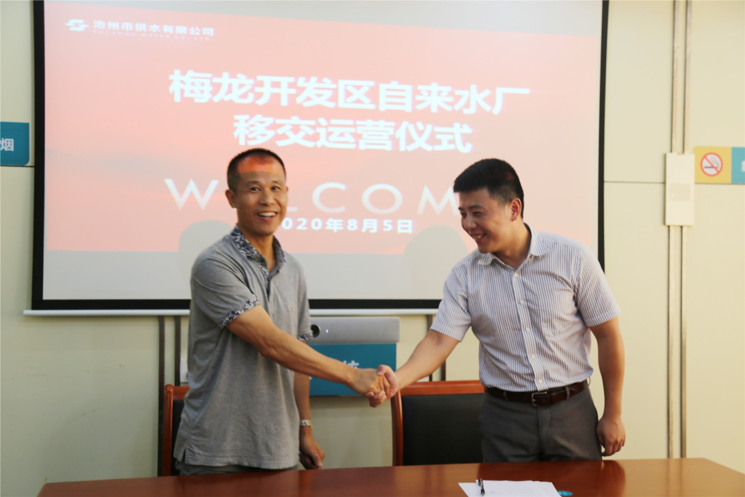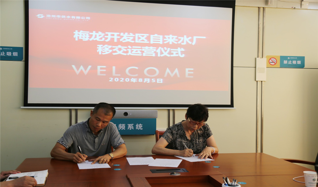 為統籌城市和農村供水事業發展,解決群眾飲水難問題,2020年8月5日下午,在池州市供水有限公司三樓會議室舉行了梅龍鎮開發區自來水廠服務片區移交運營簽字儀式。安徽省江南產業集中區建投資發展(集團)有限公司、梅龍鎮開發區自來水廠、梅龍街道辦事處相關負責人和池州市供水公司董事長楊觀樂、總經理李張兵等參加簽字儀式。