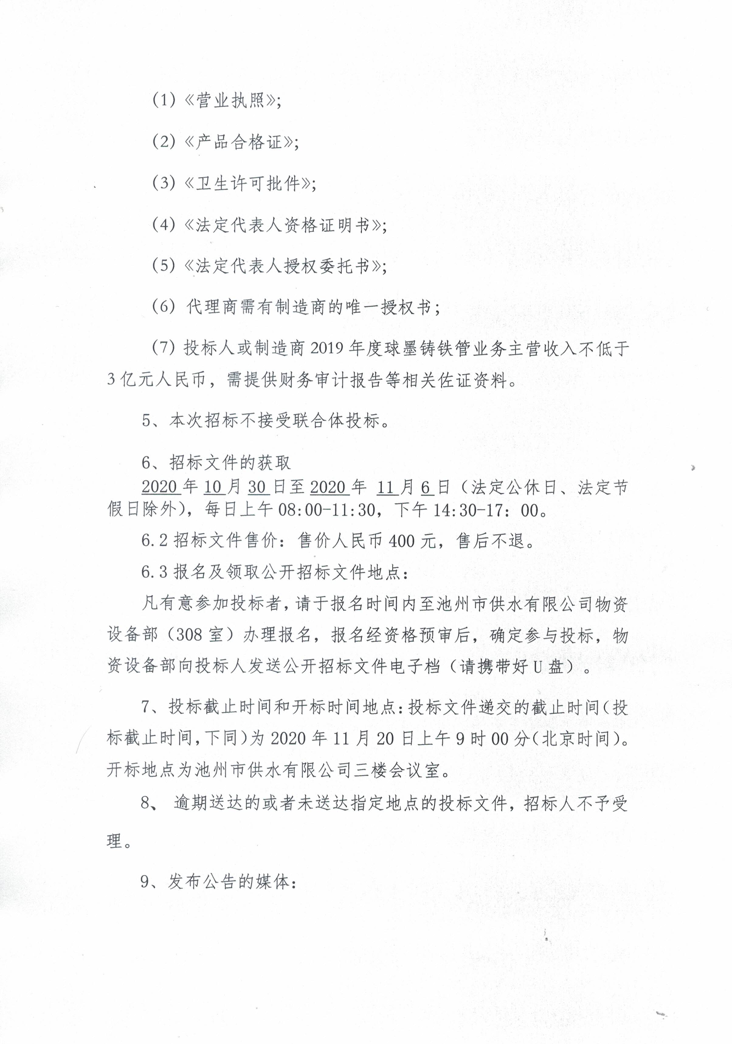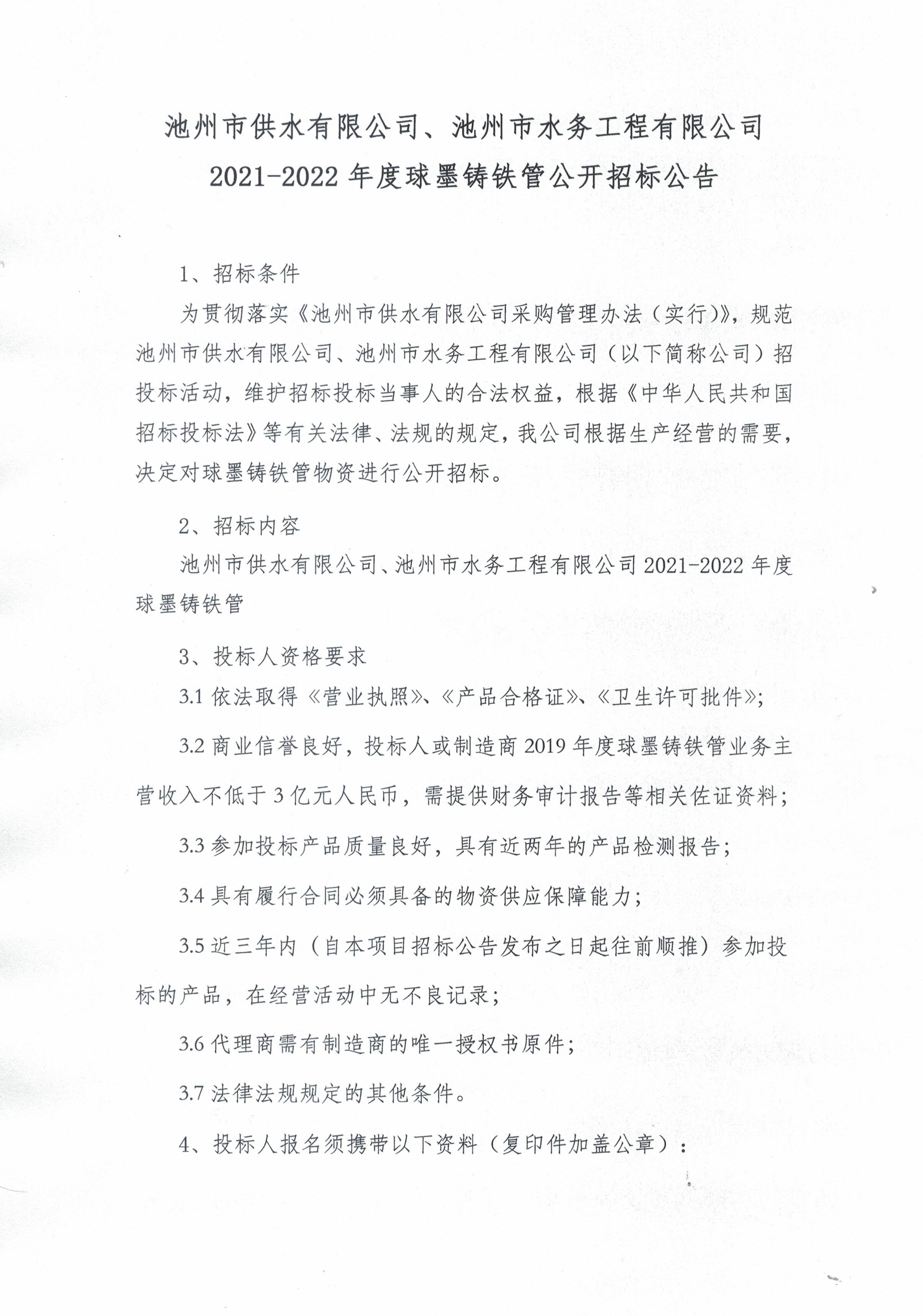 | 池州市供水有限公司、池州市水務工程有限公司2021-2022年度球墨鑄鐵管公開招標公告 | |