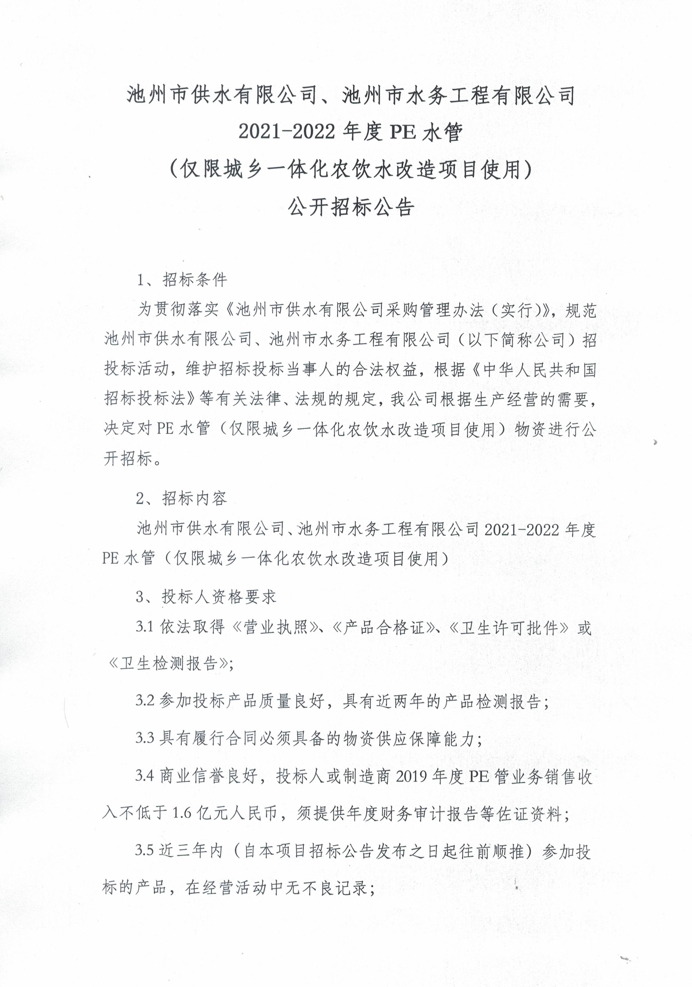 | 池州市供水有限公司、池州市水務工程有限公司.2021-2022年度PE水管(僅限城鄉(xiāng)一體化農飲水改造 | |