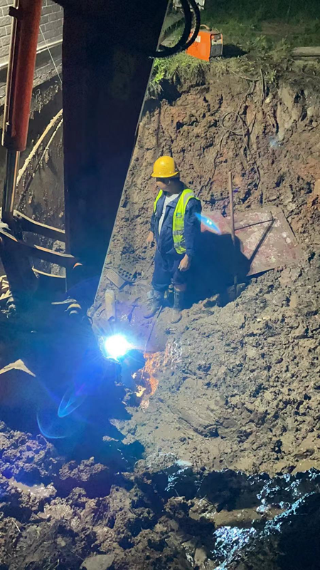 下午16:00,施工人員組織開挖尋找漏點(diǎn),發(fā)現(xiàn)漏點(diǎn)后,準(zhǔn)備進(jìn)行停水維修,但因漏點(diǎn)在出廠主干管道上,若停水施工將造成城區(qū)大范圍水壓下降,局部地區(qū)甚至中斷供水。正在施工人員困擾之際,現(xiàn)場(chǎng)技術(shù)人員經(jīng)過仔細(xì)商討,提出了一個(gè)非常巧妙地解決辦法。由于管道破損點(diǎn)很小,破損點(diǎn)周圍管道狀況良好,未出現(xiàn)擴(kuò)散性裂痕,技術(shù)人員提議采用“打補(bǔ)丁”的辦法對(duì)管道進(jìn)行維修,用一塊鋼板下面墊上橡膠片堵住漏點(diǎn),四周用螺栓錨固,再將鋼板四周與管道焊接牢固,用這樣一塊“補(bǔ)丁”封堵迅速漏點(diǎn)。