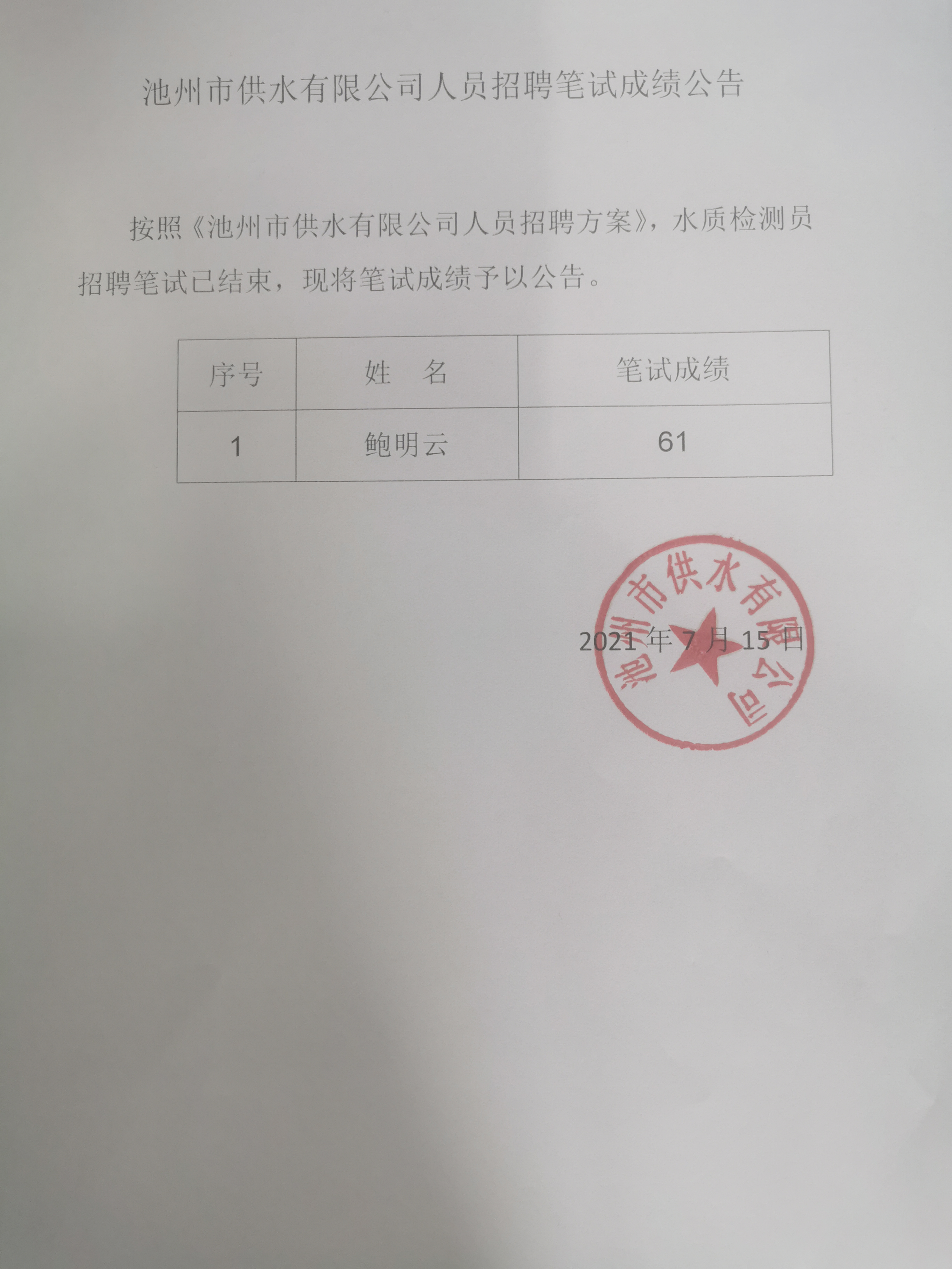 | 水質(zhì)檢測(cè)員招聘筆試成績(jī)公告 | |