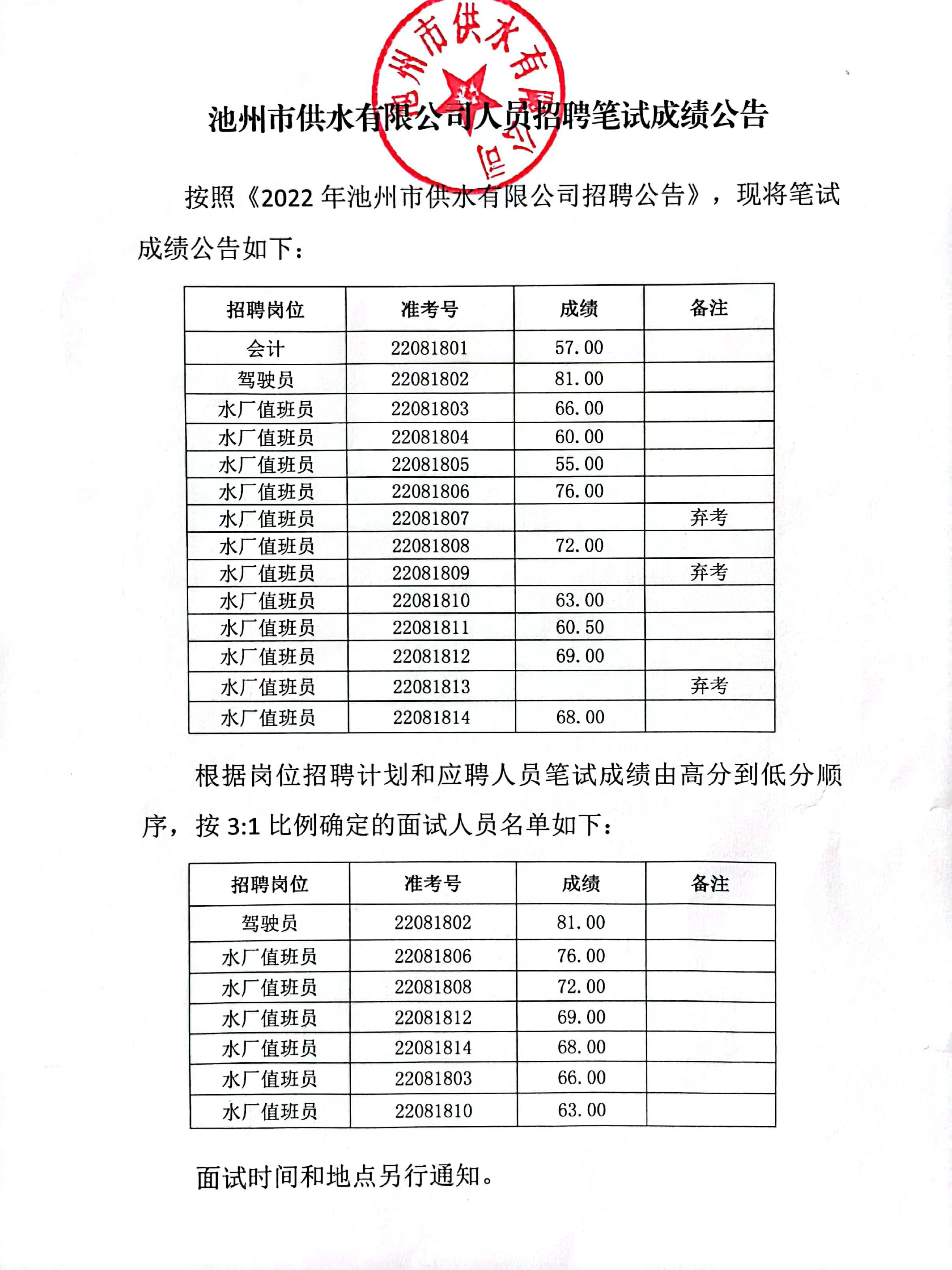 | 池州市供水有限公司人員招聘筆試成績公告 | |