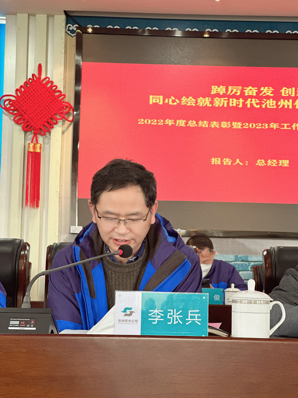會議第一項(xiàng),李張兵總經(jīng)理作題為《踔厲奮發(fā) 創(chuàng)新實(shí)干 同心繪就新時(shí)代池州供水發(fā)展新華章》的年度工作報(bào)告。他指出,2022年,是黨的二十大勝利召開及“十四五”規(guī)劃承上啟下的一年,這一年,我們堅(jiān)持以習(xí)近平新時(shí)代中國特色社會主義思想為指導(dǎo),堅(jiān)持高質(zhì)量發(fā)展統(tǒng)領(lǐng)全局,聚焦主業(yè)主責(zé),突出做好供水保障、創(chuàng)新服務(wù)、智慧賦能、產(chǎn)業(yè)鏈延伸等各項(xiàng)工作,較好地完成了各項(xiàng)目標(biāo)任務(wù);2022年,我們實(shí)現(xiàn)供、售水量、營業(yè)收入、稅收多重突破、穩(wěn)定增長,用戶數(shù)達(dá)24萬余戶,產(chǎn)銷差再創(chuàng)10.19%的佳績;我們成功接收梅龍片區(qū),深度參與貴池區(qū)城鄉(xiāng)供水一體化工程,積極配合清溪大道改造等市政重點(diǎn)工程;堅(jiān)持大安全觀,統(tǒng)籌安全生產(chǎn)、疫情防控和經(jīng)營發(fā)展;全面梳理各級管理制度,編制完成公司智慧水務(wù)頂層架構(gòu)設(shè)計(jì)、池州市城市“十四五”供水發(fā)展規(guī)劃;深入開展二十大精神學(xué)習(xí),持續(xù)開展深水黨校·池州大講堂,建設(shè)人才儲備蓄水池、做好文明創(chuàng)建賡續(xù)的接力棒等。2022年,公司客服中心榮獲安徽省住建廳“文明服務(wù)窗口”、汪學(xué)斌同志喜獲安徽省勞動(dòng)模范。公司順利完成第十三屆安徽省文明單位考核,連續(xù)5年榮獲池州市雙擁優(yōu)秀單位稱號。他強(qiáng)調(diào)2023年是池州供水創(chuàng)新發(fā)展之年,是供水保障提升的關(guān)鍵之年,新的一年,我們將堅(jiān)持以習(xí)近平新時(shí)代中國特色社會主義思想為指導(dǎo),全面貫徹黨的二十大精神,緊盯經(jīng)營目標(biāo),突出“四項(xiàng)能力”(融合發(fā)展、安全發(fā)展、創(chuàng)新發(fā)展、可持續(xù)發(fā)展),凝心聚力、踔厲奮發(fā),為推進(jìn)池州供水持續(xù)健康穩(wěn)定發(fā)展而勇毅前行。