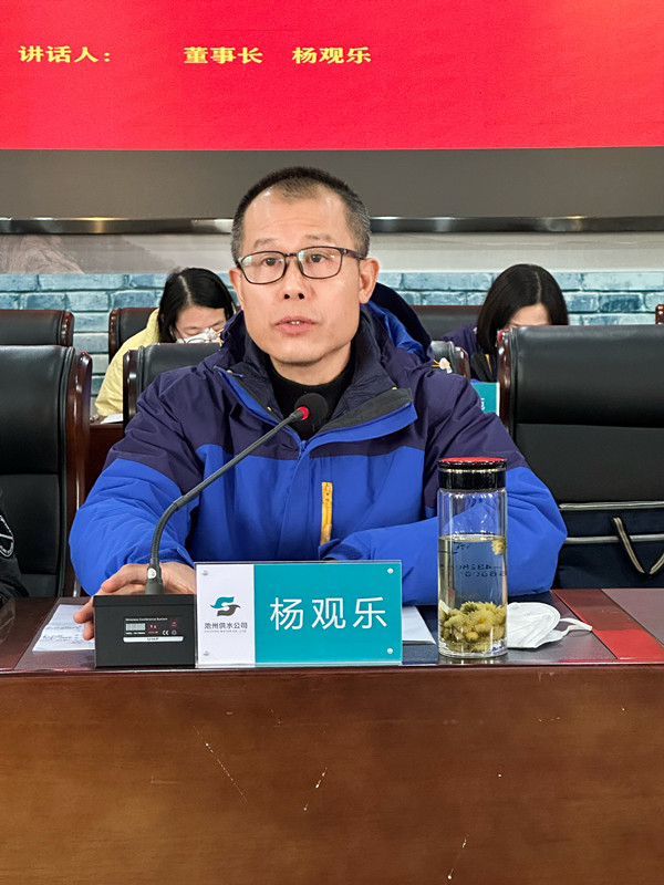 會議第三項(xiàng),楊觀樂董事長作題為《砥礪深耕 奮楫篤行 奮力開創(chuàng)池州供水高質(zhì)量發(fā)展新篇章》的主旨講話。他指出,2022年,我們面對疫情防控、內(nèi)部經(jīng)營指標(biāo)和水壓水質(zhì)輿情等多重壓力,化危為機(jī)、迎難而上,緊緊依靠廣大干部職工,真抓實(shí)干、勤勉工作,在精細(xì)管理、業(yè)務(wù)拓展、民生保障、設(shè)施建設(shè)上再獲新功;這一年,我們堅(jiān)持高舉旗幟、堅(jiān)定推進(jìn)融合發(fā)展,黨建引領(lǐng)走深走實(shí);堅(jiān)持系統(tǒng)思維、堅(jiān)定深化內(nèi)部治理,企業(yè)發(fā)展活力激發(fā)迸發(fā);堅(jiān)持守正創(chuàng)新、堅(jiān)定推進(jìn)開源節(jié)流,企業(yè)經(jīng)營提質(zhì)增效;堅(jiān)持民生至上、堅(jiān)定推進(jìn)供水保障,廣大用戶有得有感。他強(qiáng)調(diào),2023年,我們一要堅(jiān)定不移聚焦黨建創(chuàng)新,打造黨建與經(jīng)營融合的新典范;二要堅(jiān)定不移聚焦提質(zhì)增效,打造供水發(fā)展的新樣板;三要堅(jiān)定不移聚焦主業(yè)主責(zé),打造民生保障的新范例;四要堅(jiān)定不移聚焦團(tuán)隊(duì)建設(shè),打造人才建設(shè)的新高地;五要堅(jiān)定不移聚焦文化引領(lǐng),打造深水品牌的新名片。他號召大家,高舉旗幟、凝心聚力、“致廣大而盡精微”、腳踏實(shí)地、迎難而上、開拓進(jìn)取,跑出“奔池速度”,在新征程上書寫新的美麗供水篇章,為新階段“三優(yōu)池州”提供強(qiáng)有力的供水支撐,為開創(chuàng)中國式現(xiàn)代化貢獻(xiàn)池水力量。
