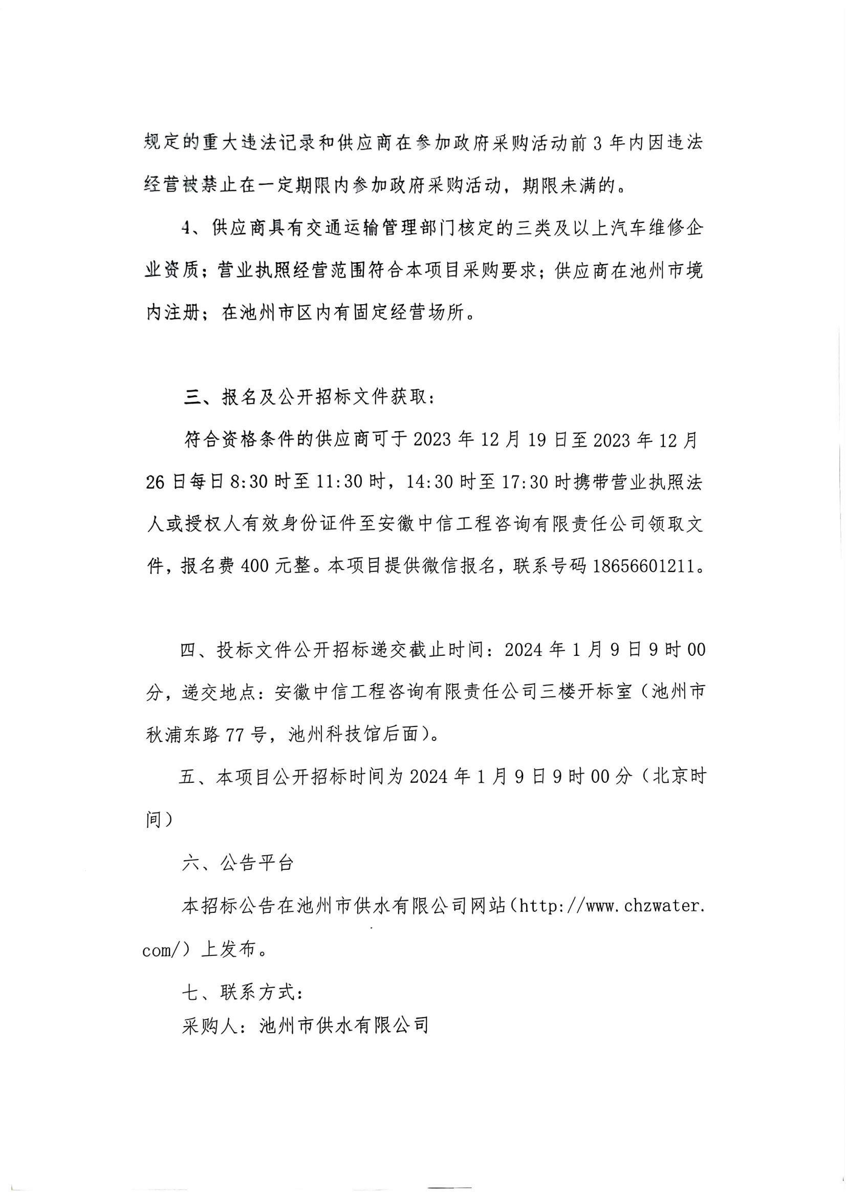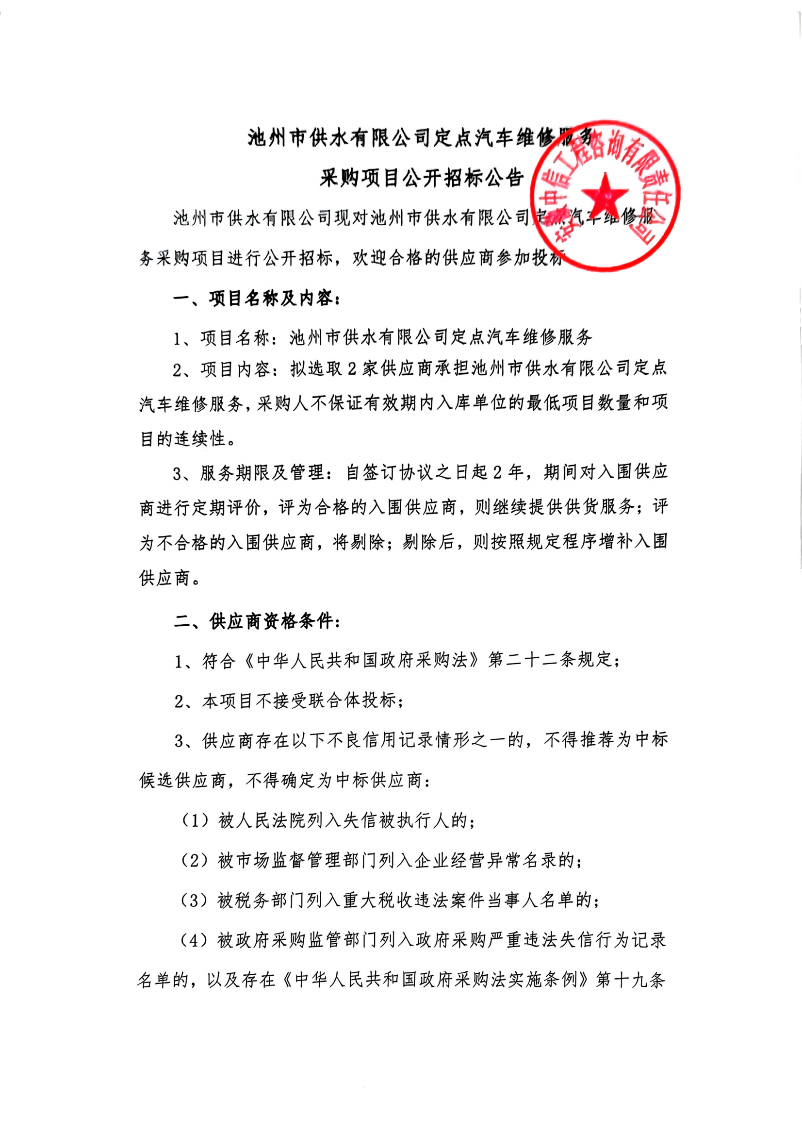 | 池州市供水有限公司定點汽車維修服務采購項目公開招標公告 | |