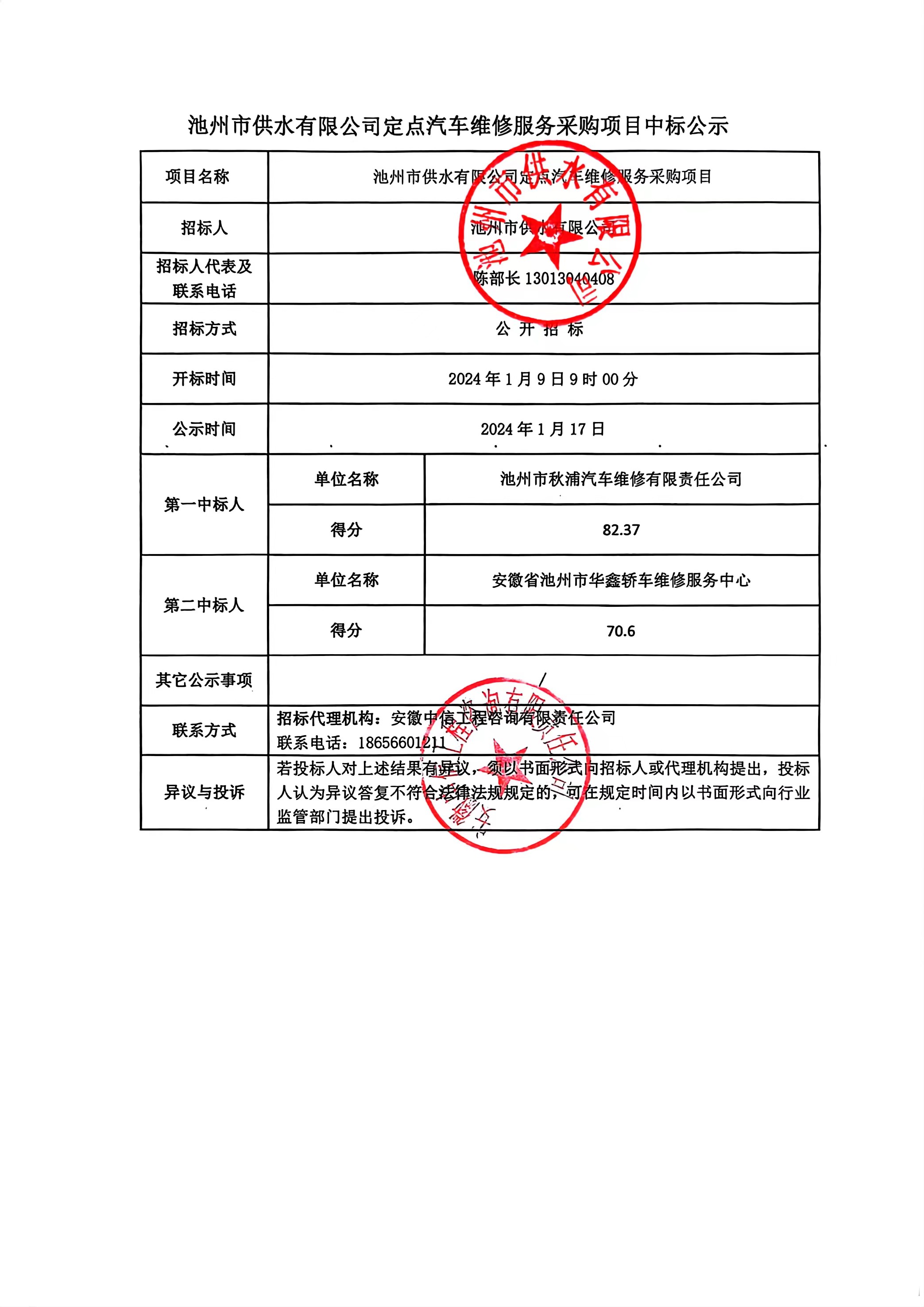 | 池州市供水有限公司定點(diǎn)汽車維修服務(wù)采購項目中標(biāo)公示 | |