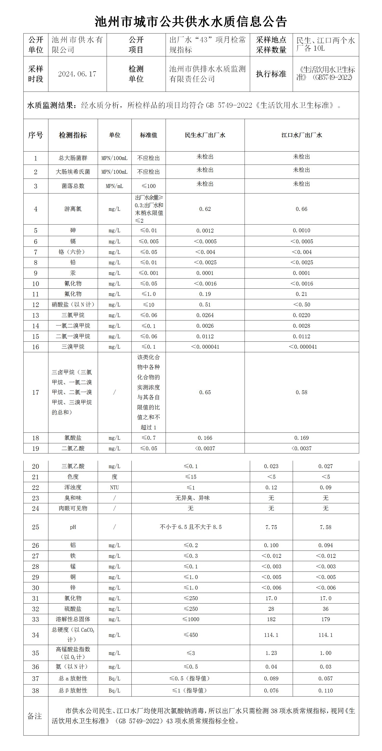 | 池州市城市公共供水水質(zhì)信息公告6月份出廠水月檢常規(guī)指標(biāo) | |