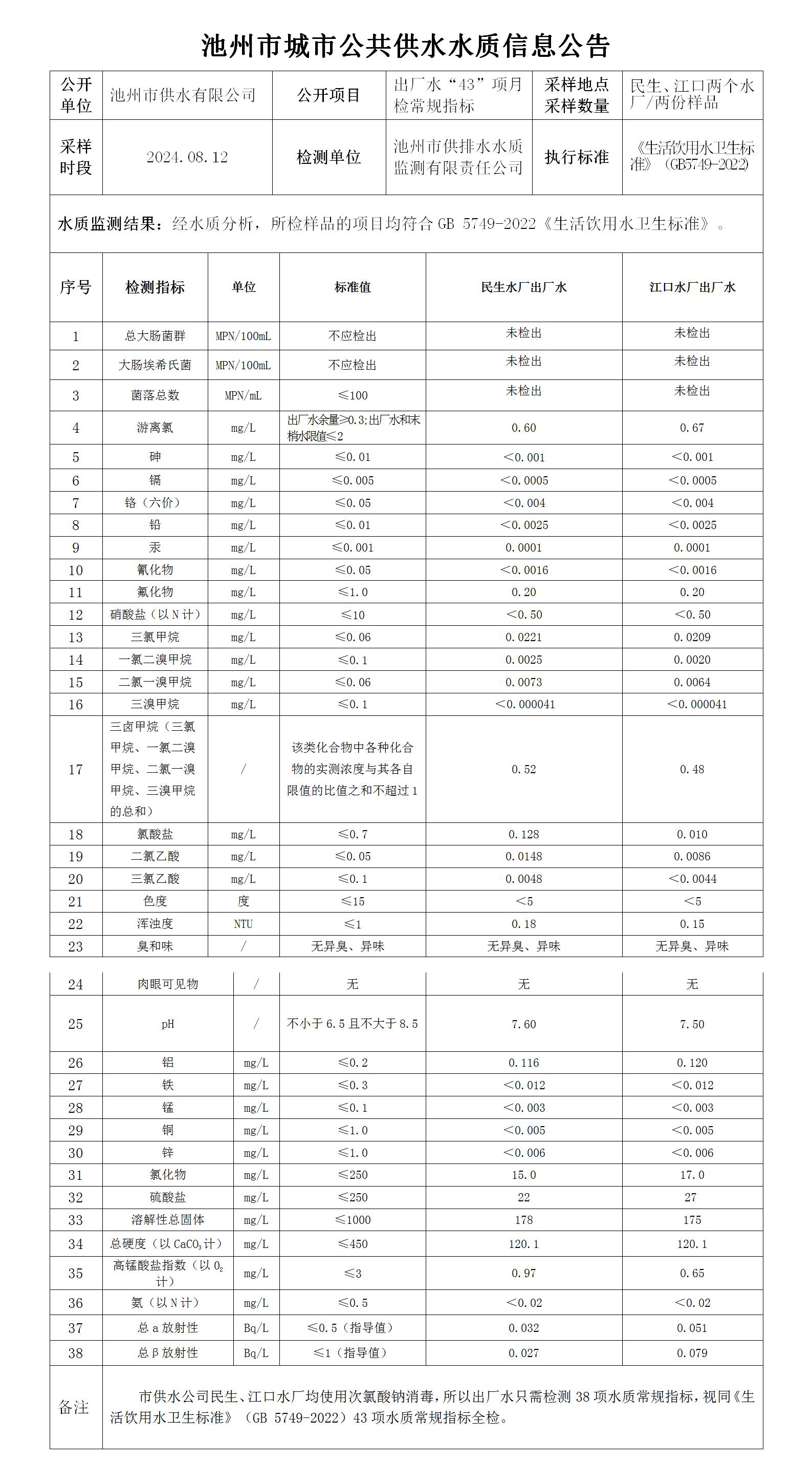 | 池州市城市公共供水水質(zhì)信息公告8月份出廠水月檢常規(guī)指標 | |