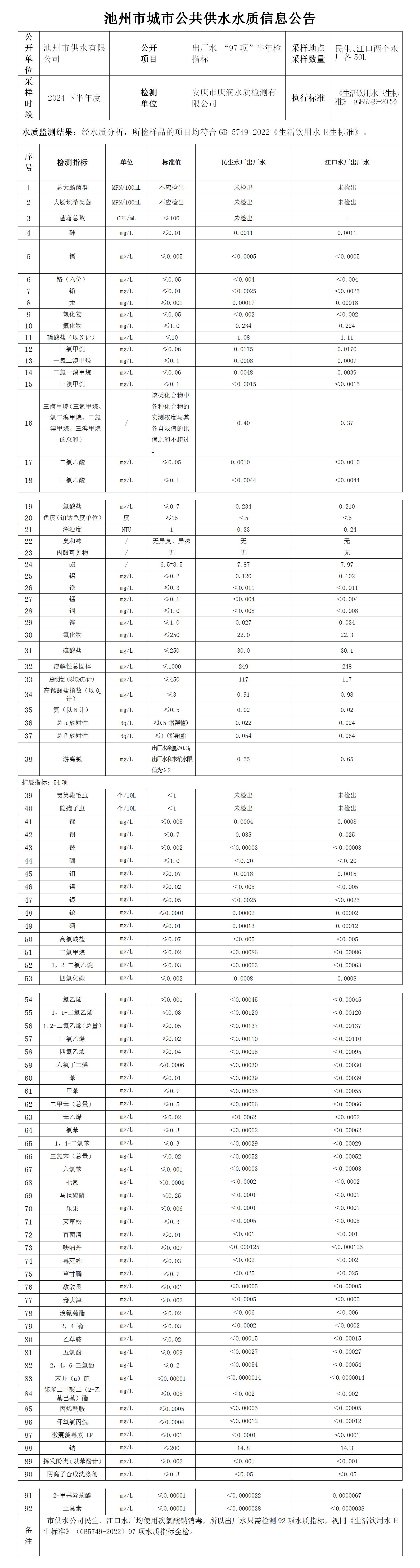 | 池州市城市供水水質(zhì)信息公告出廠水“97項(xiàng)“下半年全指標(biāo) | |