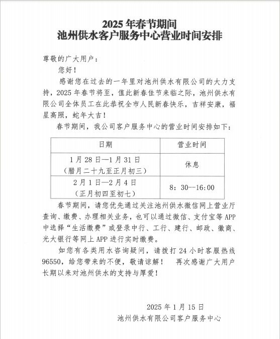 | 2025年春節(jié)期間 池州供水客戶服務(wù)中心營業(yè)時間安排 | |