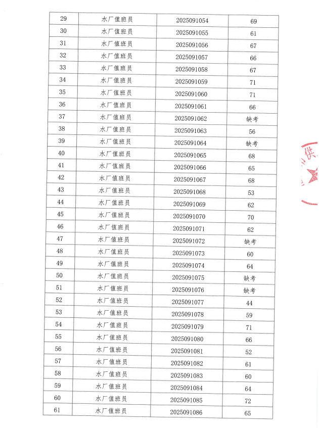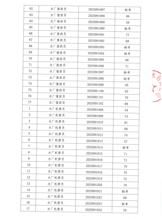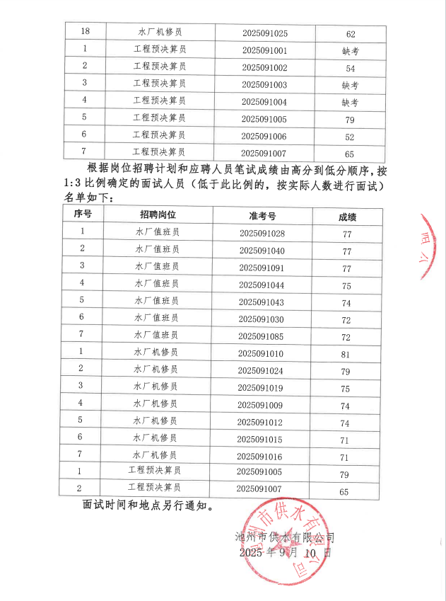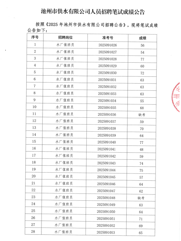 | 池州市供水有限公司人員招聘筆試成績公告 | |