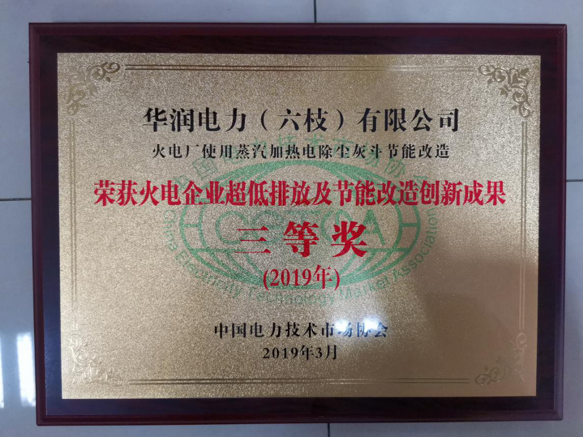 2019年獲得中國(guó)電力技術(shù)市場(chǎng)協(xié)會(huì)頒發(fā)的“2019年火電企業(yè)超低排放及節(jié)能改造成果 三等獎(jiǎng)”