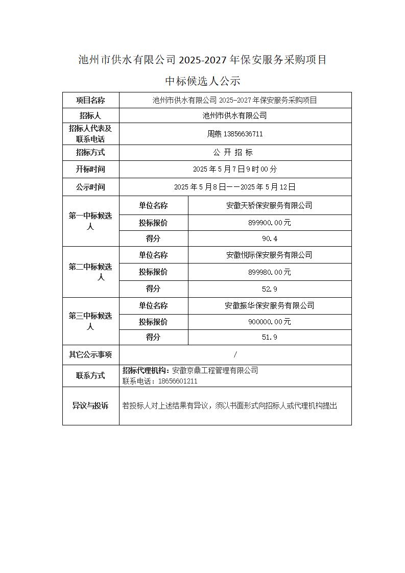 | 池州市供水有限公司2025-2027年保安服務(wù)采購項(xiàng)目中標(biāo)候選人公示 | |